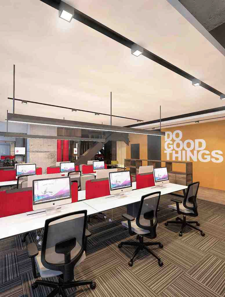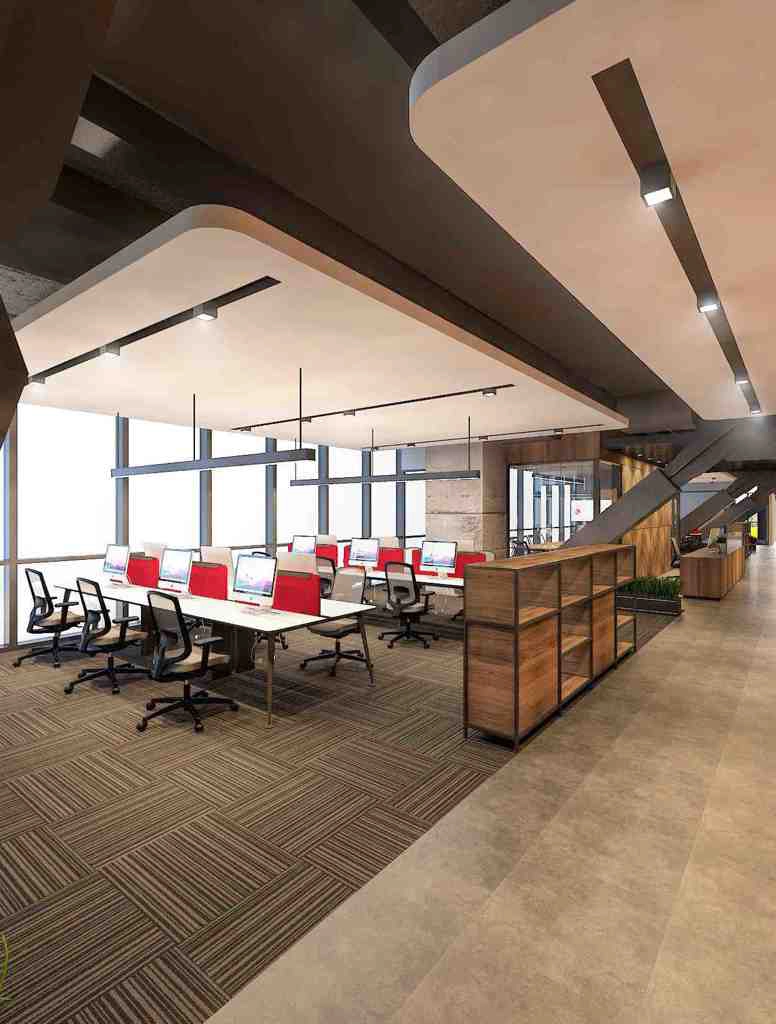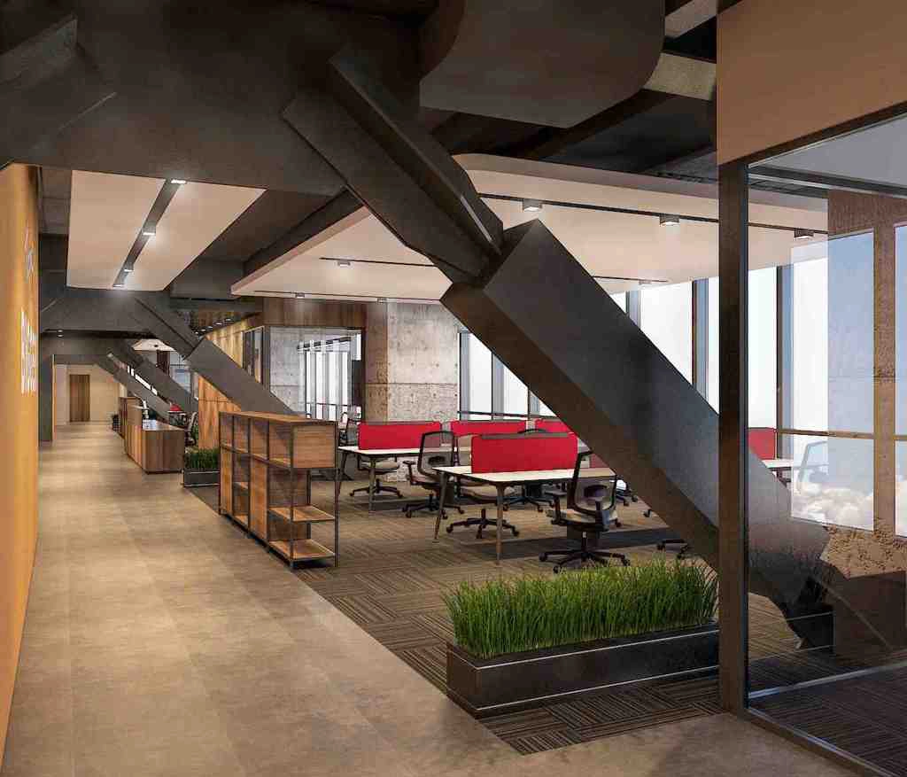 Ofis dekorasyonu ele alınırken mevcut alanda bulunan çelik taşıyıcılar da konseptin bir parçası olarak ele alınmış ve açık ofis mantığında proje gerçekleştirilmiştir.